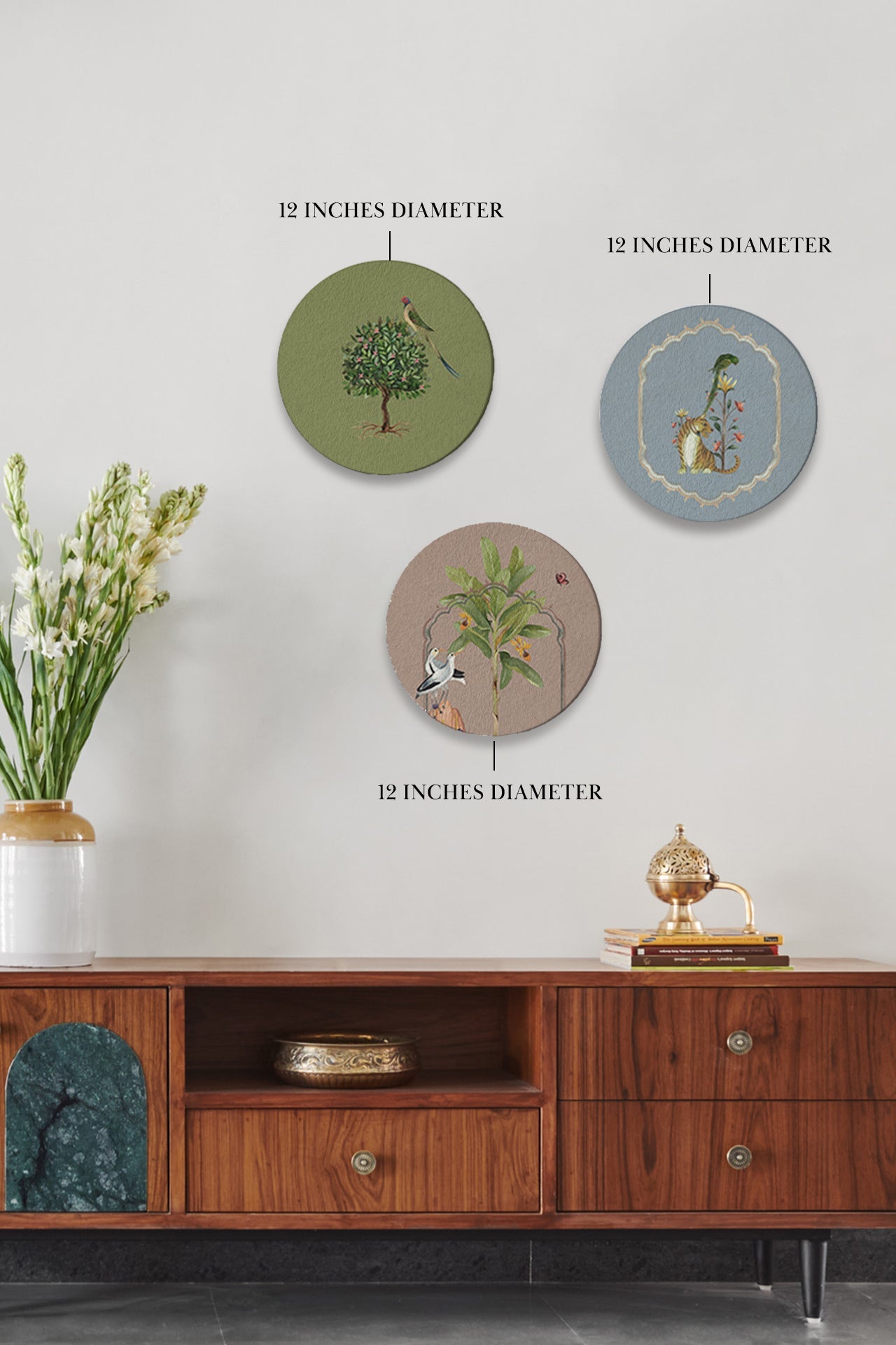 Elevate your home or office wall decor with our "Jungle Cassata" Wall Art set. Imagine a carnival of scents blowing in the air and thin strands of light peeking from the sky - what a spirit lifting scene! This exquisite collection features three round Wall Art pieces. One frame showcases a vibrant parakeet perched atop a tree with exposed roots and blooming pink flowers, the second depicts an Indianised arch with a lush plant, a butterfly and two seagulls perched on a rock, gazing at the plant, while the third features a majestic tiger against a pale blue backdrop, accompanied by a vibrant plant and a parrot perched atop it, all framed by an exquisite Indianised border. Inspired by the detailed foliage from miniature paintings, this canvas Wall Art set is perfect for adding elegance and storytelling to your home or office wall decor. Enhance your space and buy canvas Wall Art today.
